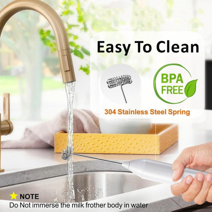 Snap the stainless-steel head off, rinse under water, done. (Frother body is splash-proof—do not immerse.)