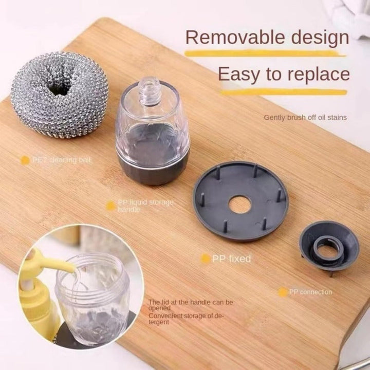 High-quality steel wire mesh wrapped tight for powerful, long-lasting scrubbing—paired with a refillable press-to-dispense tank that feeds detergent right where you need it.